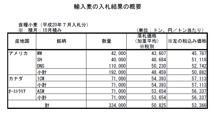 政府買入価格(輸入小麦の買入価格)は、毎月、30万トン〜50万トン規模の入札が行われ、価格が決定されます。