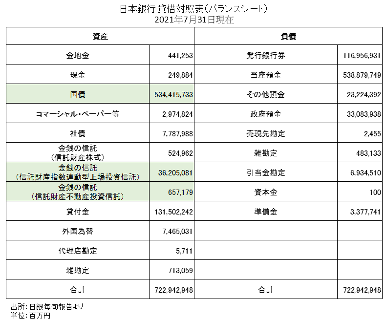 国債・日本株ETF・J-REITの日銀の保有残高はこちらです。【2021年7月31日現在】国債:534兆円日本株ETF:36兆円J-REIT:6,571億円国債・日本株・J-REITの市場規模(時価総額)はこちらです。【2021年7月31日現在】国債:約1,000兆円日本株:約724兆円J-REIT:約17兆円とうとう国債は50%以上を日銀が保有するところまで来てしましました。ファイナンシャルスター [6] より