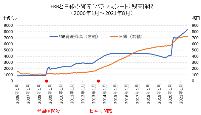 政府が国債をどんどん発行すれば、最終的な国債の引受先となる日銀では、国債が蓄積され資産が上昇していくことになります。2021年7月のバランスシートを見ると、日銀が保有する国債は534兆円にもなっていて、日本国債の市場規模(時価総額約1000兆円)の半分以上を占めています。ここ10数年の日銀の資産推移を見ても、上昇を辿る一方です。