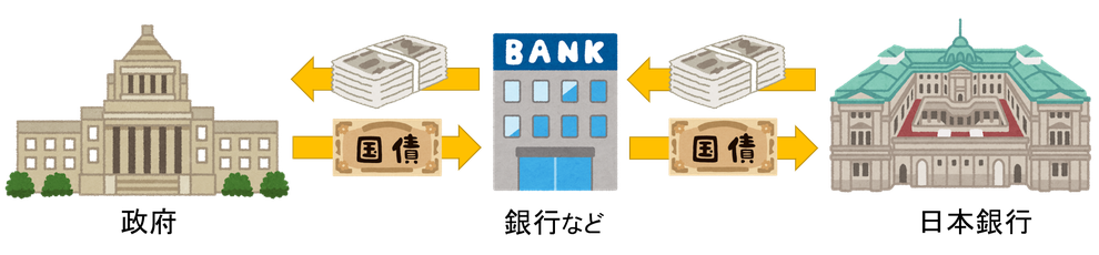 日本を例にとると、政府-日本銀行-民間銀行の関係は、以下の図版のようになっています。政府が国債を発行し、民間銀行などの金融機関が国債を引受け、日銀がそれを買取る。一方で紙幣発行機関である日銀は紙幣を発行し、国債とは逆の動きでお金が動きます。